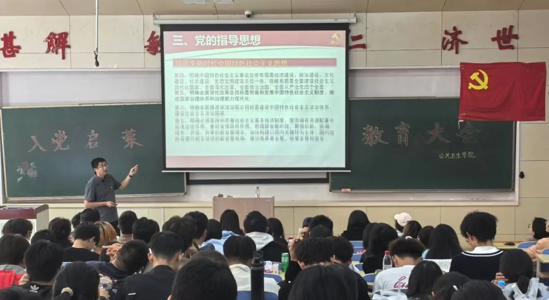 组织员吴寒向大家详细介绍了发展党员的基本要求、基本流程和常见问题,鼓励同学们积极响应党的号召,紧跟党的步伐,学习党的路线方针政策,提升自身思想觉悟和理论水平,以实际行动向党组织靠拢。
