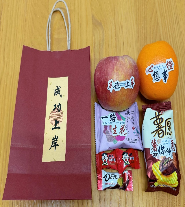 学院精心为每位考研学子准备了“考研加油包”,每一份礼物背后都有其独特的意义:在考研这条充满挑战的道路上,愿考研学子都能“心想事橙”,所有的心愿都能实现;在考研的征途中,每一步都能繁花似锦,绽放光彩,收获一路的美好与成功,走出自己的“一路生花”;“苹稳上岸”是对考研学子们最殷切的期盼,祝愿能够顺利抵达梦想的彼岸;“薯愿薯愿,属你所愿”,所有的好运都属于你们,每一个愿望都能够成真,在考研中取得理想的成绩;“旺仔糖”象征着旺盛的精力和满满的元气,希望学子们在备考和考试时都能精神饱满,充满力量,好运旺旺旺;“小德芙”寓意着在考研路上能够得到福气,巧克难题,取得成功!