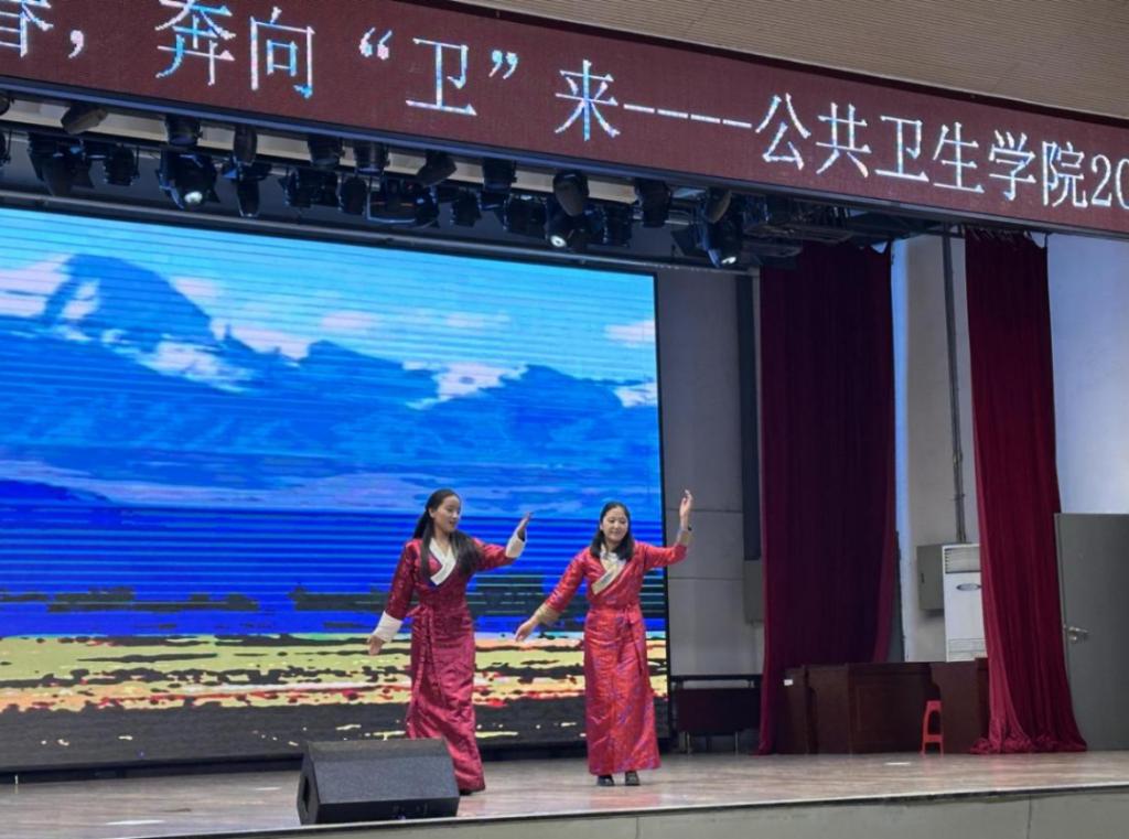 紧接着,由2023级预防专业的索央和旦增巴姆两位同学带来的藏族舞蹈《羌塘宝地》更是让观众们沉浸其中。她们的舞蹈热情洋溢,节奏活泼欢快,充分体现了浓郁的民族特色,也展现了民族舞蹈淳朴的特点。