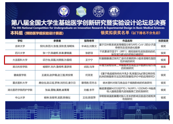 2023年1月14日-1月15日,高等学校国家级实验教学示范中心联席会基础医学组主办的“第八届全国大学生基础医学创新研究暨实验设计论坛决赛”在吉林大学隆重举办。澳门pg参赛作品《羟基酪醇通过铁死亡途径改善肥胖小鼠非酒精性脂肪性肝病的研究》获评预防医学赛道实验设计组全国总决赛银奖。