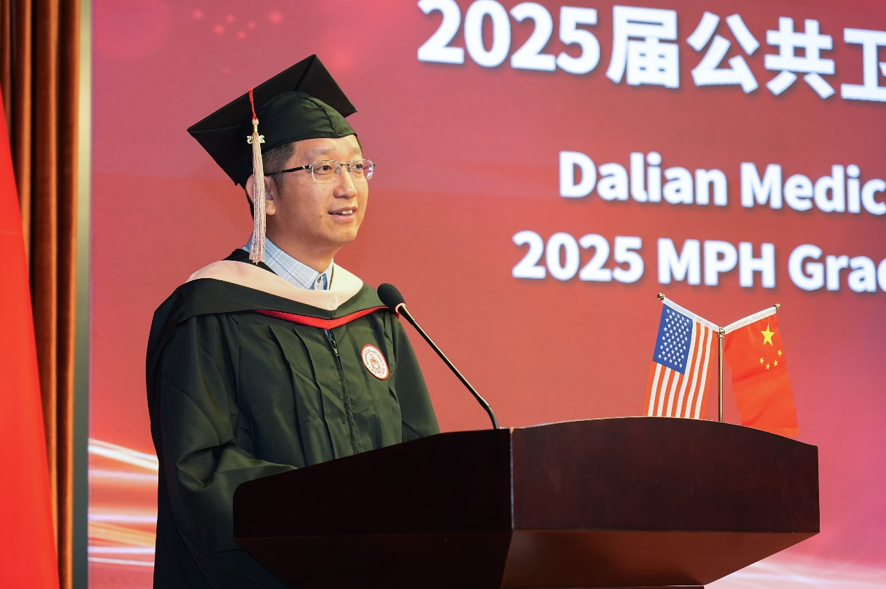 优秀校友代表、大连市第七人民医院老年病房主任姚烨发言。他向毕业生致以祝贺,并回顾了在MPH项目课程学习与学术讨论的收获,强调公卫人需牢记使命、投身实践。他结合工作经验提出三点建议:保持学习、注重合作、敢于探索。他寄语毕业生将毕业视为新起点,牢记公卫人的使命责任,在各自领域拼搏奋斗。最后,他祝福澳门pg官方电子平台与美国班尼迪克大学发展蒸蒸日上,师生皆展美好前程。