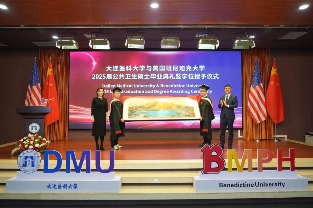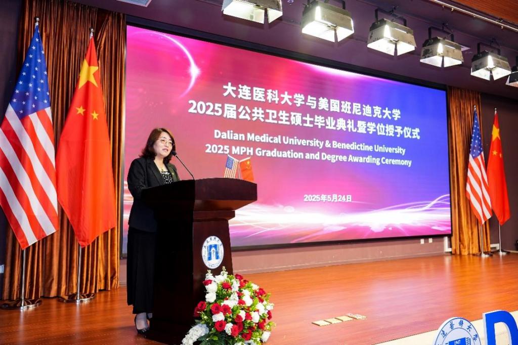 5月24日,我校与美国班尼迪克大学2025届公共卫生硕士毕业典礼暨学位授予仪式隆重举行。经过两年的辛勤学习,78名毕业生顺利获得美国班尼迪克大学硕士学位。美国班尼迪克大学校长Joseph J. Foy博士亲赴我校参加毕业典礼。我校副校长邵淑娟、澳门pg官方电子平台院长孙鲜策、国际教育学院副院长高鹏、澳门pg官方电子平台副院长陈欣、中美合作MPH项目的授课教师、教学督导代表和毕业生等共同出席本次典礼。典礼由孙鲜策主持。