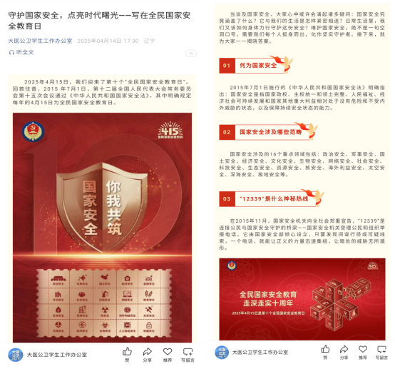 2025年4月15日,我国迎来第十个“全民国家安全教育日”。学院以微信公众号为平台推送了“国家安全日”相关教育内容,今年活动的主题是“全民国家安全教育走深走实十周年”,既是对过去十年国家安全工作成就的系统总结,也是对全社会共同维护国家安全的再动员。